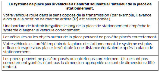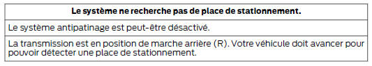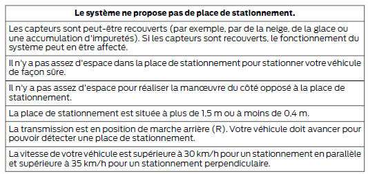 Note : vous devez veiller à ce que la place sélectionnée reste dégagée à tout moment pendant toute la manoeuvre. Note : l'aide active au stationnement peut ne pas détecter le mobilier urbain et d'autres éléments. Assurez-vous que la place sélectionnée convient au stationnement du véhicule. Note : lorsque vous cherchez une place de stationnement, vous devez conduire autant que possible votre véhicule de façon parallèle aux autres véhicules. Note : le système propose toujours la dernière place de stationnement détectée (par exemple, si votre véhicule détecte plusieurs places, le système propose la dernière place trouvée). Note : si la vitesse du véhicule est supérieure à 35 km/h environ, le système affiche un message vous demandant de ralentir.