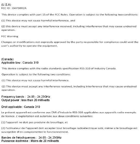 Le terme "IC: " placé avant le numéro de certificat radio signifie seulement que les spécifications techniques de Industry Canada ont été respectées. L'antenne utilisée pour ce transmetteur ne doit pas être placée à proximité immédiate d'une autre antenne ou un d'autre transmetteur, ou ne doit pas être utilisée conjointement avec ceux-ci. Les instructions d'installation et les conditions d'utilisation du transmetteur satisfaisant aux normes d'exposition aux fréquences radio doivent être fournies aux utilisateurs finaux ou aux techniciens d'installation.