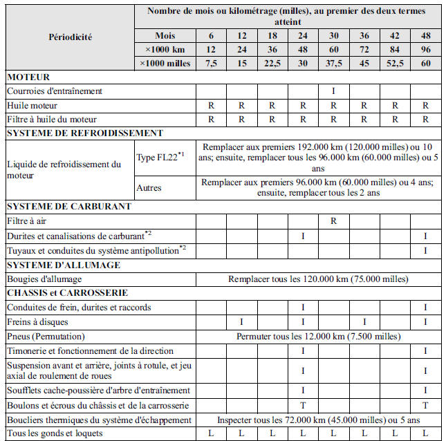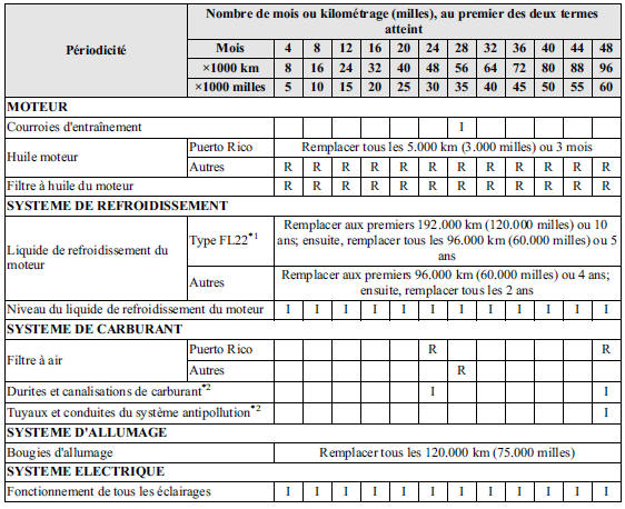 *2 Suivant la réglementation fédérale et provinciale ou de l'Etat, le manque de suivre ces points d'entretien n'annulera pas la garantie sur le système antipollution. Cependant, Mazda recommande que tous les points d'entretien soient exécutés suivant le nombre de mois ou le kilométrage (millage) recommandé, afin d'assurer une fiabilité à long terme.