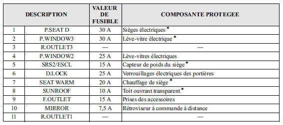 Si un fusible de rechange n'est pas disponible, utiliser un fusible de même valeur nominale issu d'un circuit non nécessaire à la conduite du véhicule, comme le circuit AUDIO ou OUTLET.