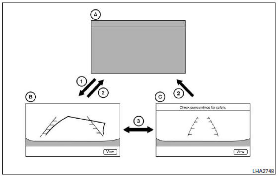 Lorsque vous appuyez de nouveau sur la touche " View " (vue) 3 , la vue arrière à grand angle B est affichée.