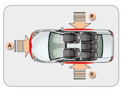 Il se déclenche simultanément avec les airbags latéraux correspondants en cas de choc latéral violent appliqué sur tout ou partie de la zone d'impact latéral B , s'exerçant perpendiculairement à l'axe longitudinal du véhicule dans un plan horizontal et de sens extérieur vers intérieur du véhicule.