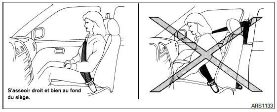 Même si votre véhicule est muni du dispositif de sac gonflable perfectionné NISSAN, les ceintures de sécurité doivent toujours être portées correctement. De plus, le conducteur et le passager avant doivent être assis bien droit et aussi loin que possible du volant et du tableau de bord.