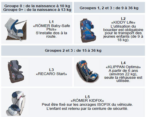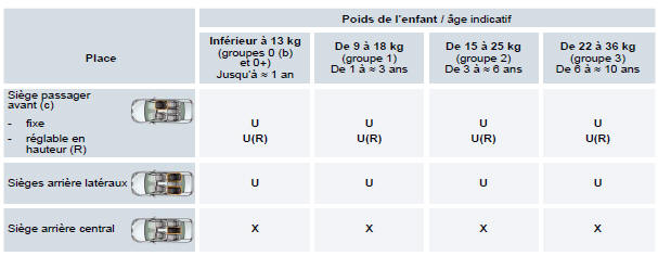Conformément à la réglementation européenne, ce tableau vous indique les possibilités d'installation des sièges enfants se fi xant avec la ceinture de sécurité et homologués en universel (a) en fonction du poids de l'enfant et de la place dans le véhicule.