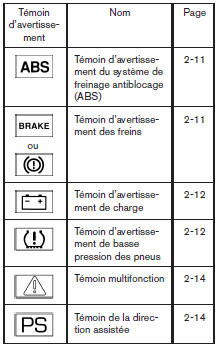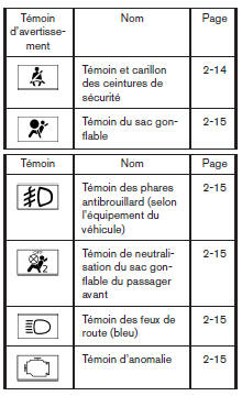 Nissan Altima: Témoins d'avertissement ou de fonctionnement