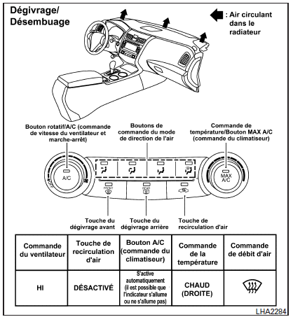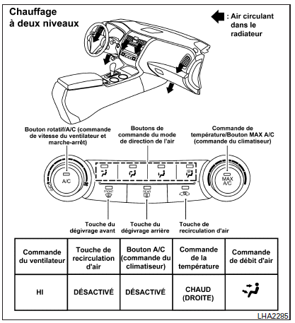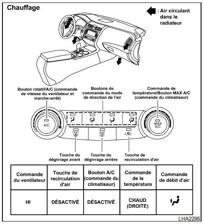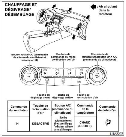 Nissan Altima: Tableaux de direction de l'airLes tableaux suivants indiquent les positions des boutons et des commandes pour réchauffer ou pour refroidir l'habitacle, ou encore pour dégivrer les glaces de façon OPTIMALE ET RAPIDE. Le bouton de recirculation d'air doit toujours être mis hors fonction en vue du chauffage et du dégivrage.